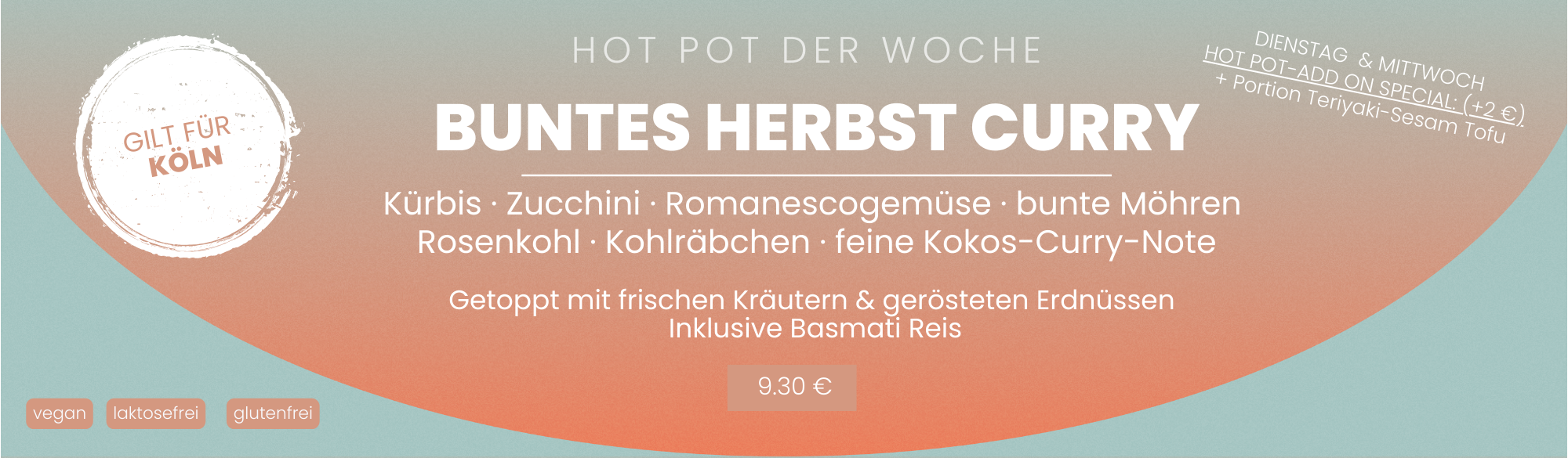 Saisonale Blattsalate · geröstete Süßkartoffeln · Apfel · Rote Linsen · Brokkoli · Gurken · Möhren · Tamari-Mandeln